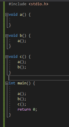 main()이 실행되고 a()가 실행되고 반환되어 main() 으로 돌아가서 b()가 실행되고 b()에서 호출한 a()가 실행되고 다시 반환되어 b()로 돌아가고 b()에서 main()으로 돌아가서 이제 c()를 수행하고 c()에서 a()를 실행하고 수행후 c()로 돌아가서 b()를 수행하고 b()에서 a()를 호출하고 반환되면 b()로 돌아가고 c()로 돌아가고 c()를 마무리 하고 main()으로 돌아가는 순서로 함수가 실행됩니다.
