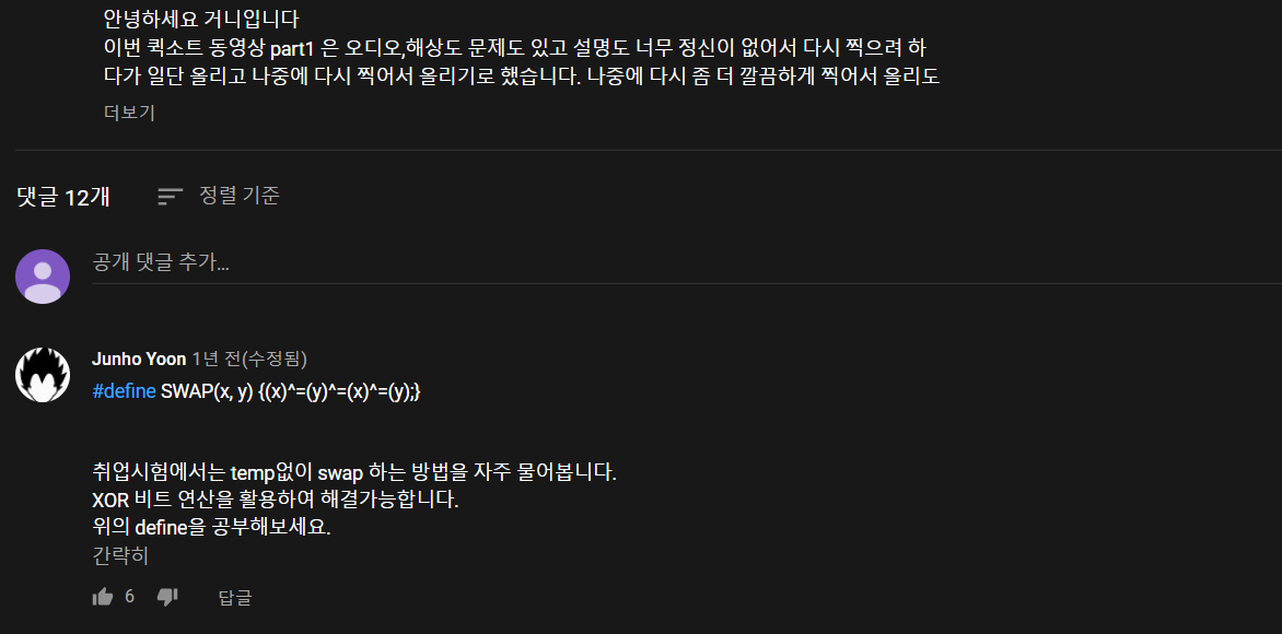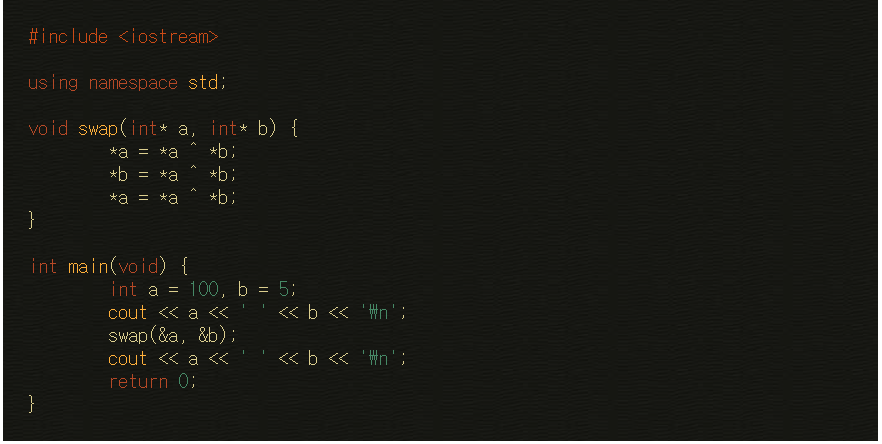 XOR 연산의 의미를 깊게 바라볼 필요가 있다 1. 0과 연산하면 자기 자신이, 1과 연산하면 비트가 반전된다 2. 교환, 결합 법칙이 성립된다 #include using namespace std; void swap(int* a, int* b) { *a = *a ^..