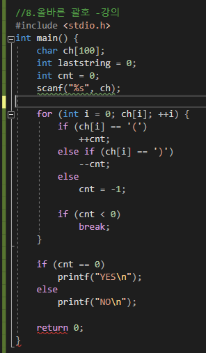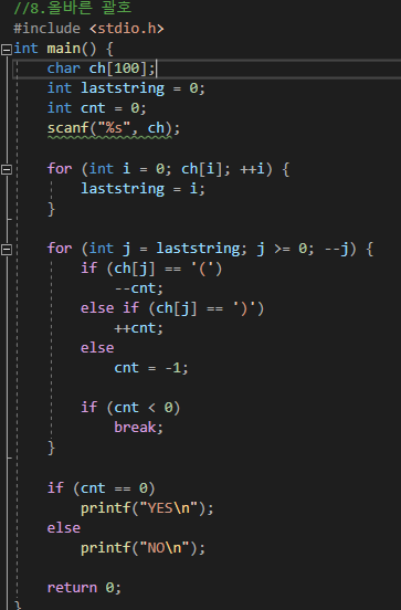 - 개행 괄호가 있으면 반드시 폐행 괄호가 있어야함 마지막 괄호가 '(' 이면 올바르지 않은 괄호 "NO"