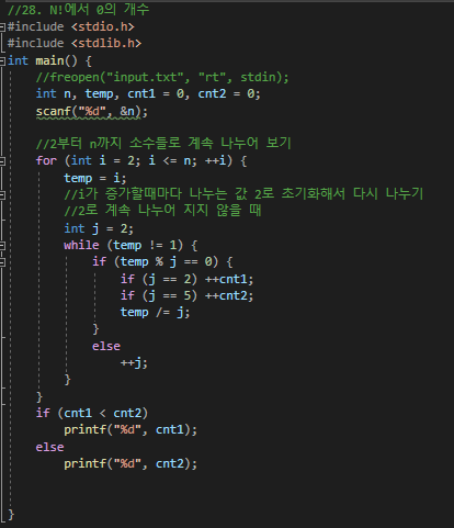 - 코드 2는 위와 거의 같지만 소인수 분해를 하면서 2의 개수와 5의 개수만 미리 카운트해서 다시 반복문을 한번더 체크하는 연산회수를 줄인다. 그리고 2와 5가 짝이 맞아야 10의 배수가 되므로 작은 값을 출력하게 한다.