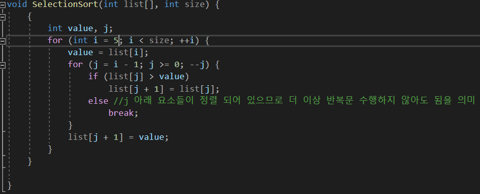 else break;는 아래값들은 더 정렬 되어 있기 때문에 if 조건에 해당하지 않으면 loop문을 빠져나가야한다. 그래야 쓸데 없는 조건문을 검사할 필요 없을 뿐더러 j 값이 더이상 변경 되지 않은 상태에서 자기가 원래 있던 자리에 value 값을 다시 삽입할 수 있기 때문이다.