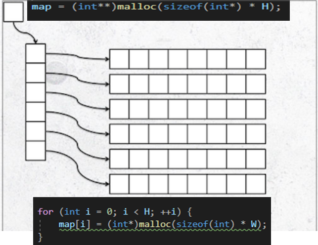 - map = (int**)malloc(sizeof(int*)*H); 를 통해 세로(높이) 공간을 할당 해준다. map이라는 이중Pointer 변수에 저장해준다.