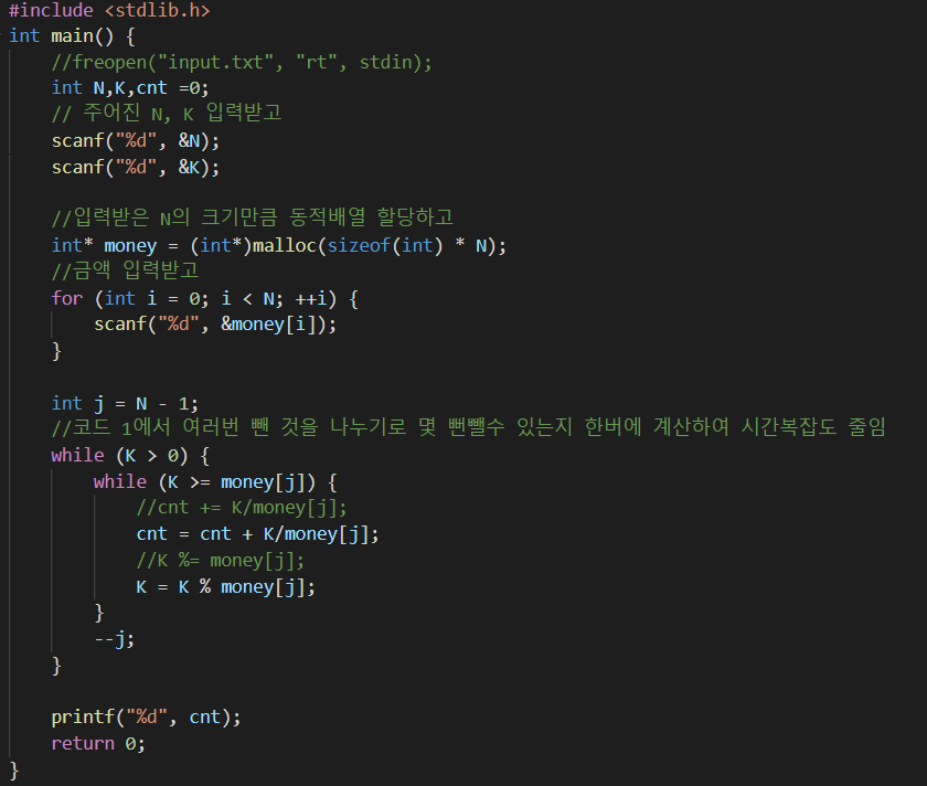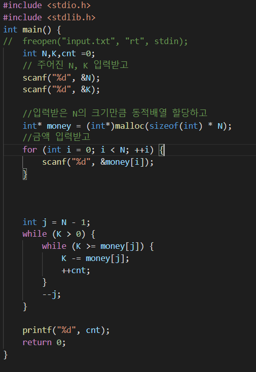 첫째 줄에 N과 K가 주어진다. (1 ≤ N ≤ 10, 1 ≤ K ≤ 100,000,000) 둘째 줄부터 N개의 줄에 동전의 가치 Ai가 오름차순으로 주어진다. (1 ≤ Ai ≤ 1,000,000, A1 = 1, i ≥ 2인 경우에 Ai는 Ai-1의 배수)