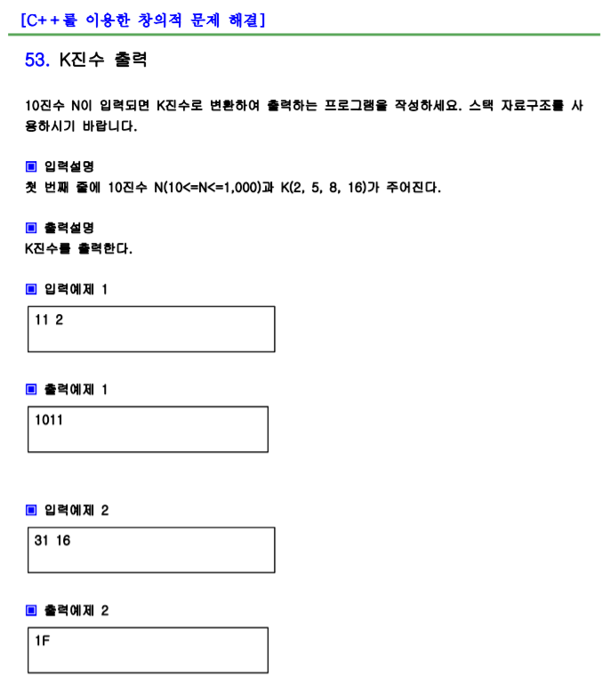 몫이 0 이 될 때 까지 몫을 진수 값으로 나누기 반복(최초의 몫은 주어진 정수값)