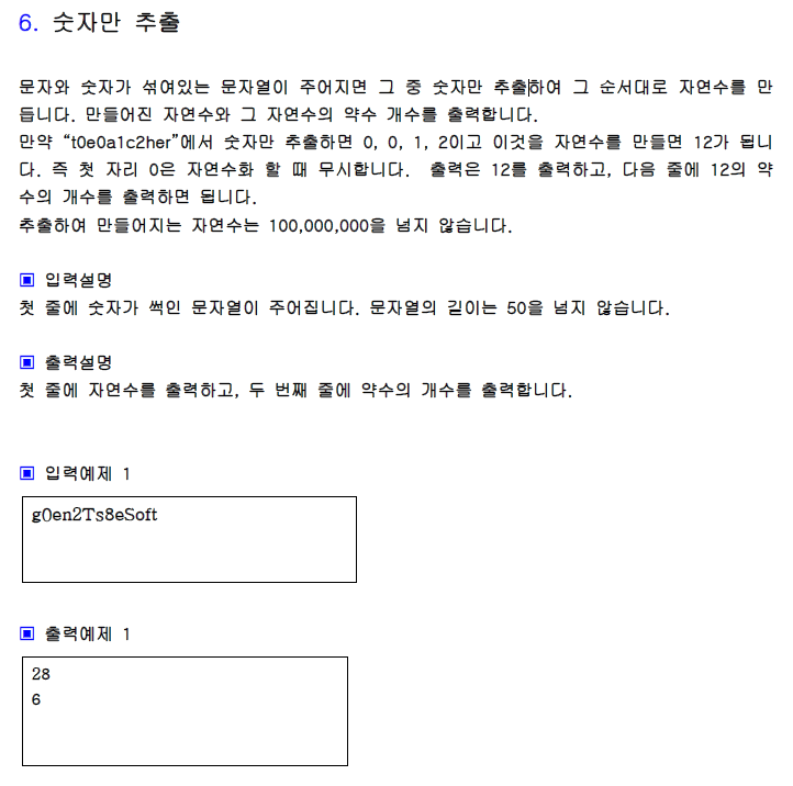 - i값을 1부터 1씩 증가시키면서 문자열에서 추출한 숫자(res)를 i값으로 나누어서 나누어 떨어지는 경우를 찾으면 된다. 이때 약수는 항상 짝을 가지게 되므로 i는 i*i가 res보다 작거나 같은 시점까지만 계산을 해주면 된다. 그리고 나누어 떨어지는 숫자가 존재하면 +2씩 증가시켜 주면 되는데, 이때 예외 사항은 짝이 자기자신인 숫자이다. 즉, i값의 제곱이 해당 숫자(res)가 될때 이다. 이때는 약수의 개수를 1증가 시켜야 한다. 그리고 i는 바로 이시점까지만 반복문을 수행하고 다음부터는 더이상 약수를 구하지 않아도 된다. 이유는 이미 짝지어진 개수를 구했기 때문이다.