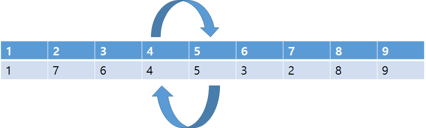- 그리고 a,b 값이 2와 7일 때 2,7구간의 값을 역순으로 바꾸어 주어야하는데 역순이 되기 위해서는 2인덱스와 7인덱스의 값을 바꾸고, 3 인덱스와 6인덱스의 값을 바꾸고 4인덱스와 5인덱스의 값을 바꾸어 주면된다.