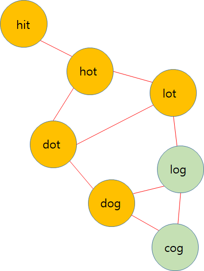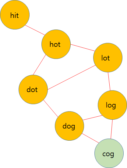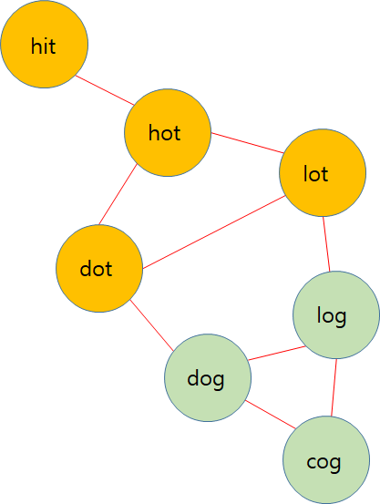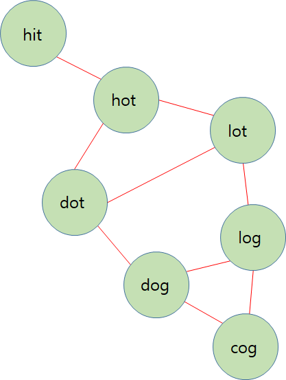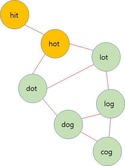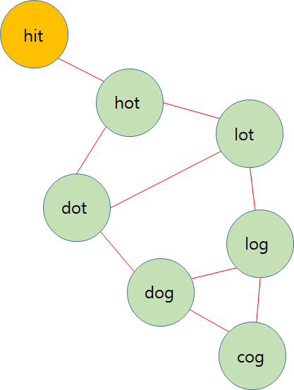 - 문자열을 비교해서 하나의 문자만 다른 문자열끼리 인접리스트 형태로 그래프를 생성한다.