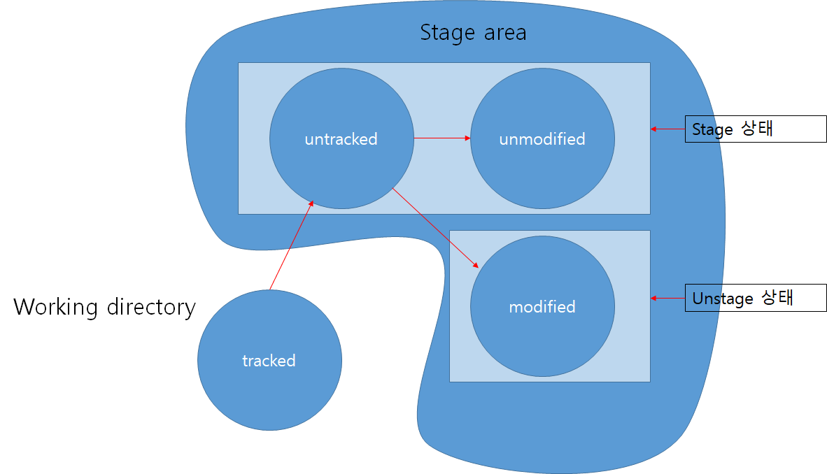 - 넓게 보면 아직 stage 영역에 등록되지 않은 working directory 안의 파일도 ustage 상태라고 생각할 수 있습니다. 이때는 unstage 상태이자 동시에 untracked 상태입니다.