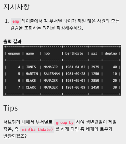 - 서브쿼리는 그룹별로 데이터를 묶어 주고 묶여진 데이터에서 가장 나이가 많은 생년월일을 추출한다. 그리고 이렇게 추출한 컬럼을 서브쿼리로 하여 in 연산자와 메인쿼리와 연산을 하면 원하는 값을 얻을 수 있다. 메인 쿼리에서 서브쿼리의 데이터와 맞는 데이터를 추출할 수 있기 때문이다.