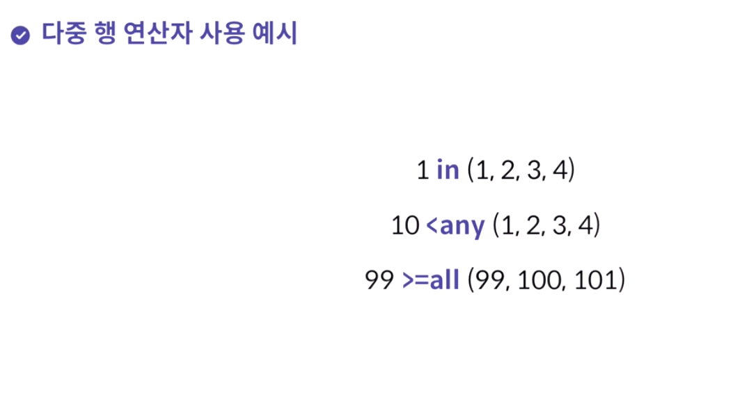 - 단일행 연산자는 =,<>,> >= 등이 있다.