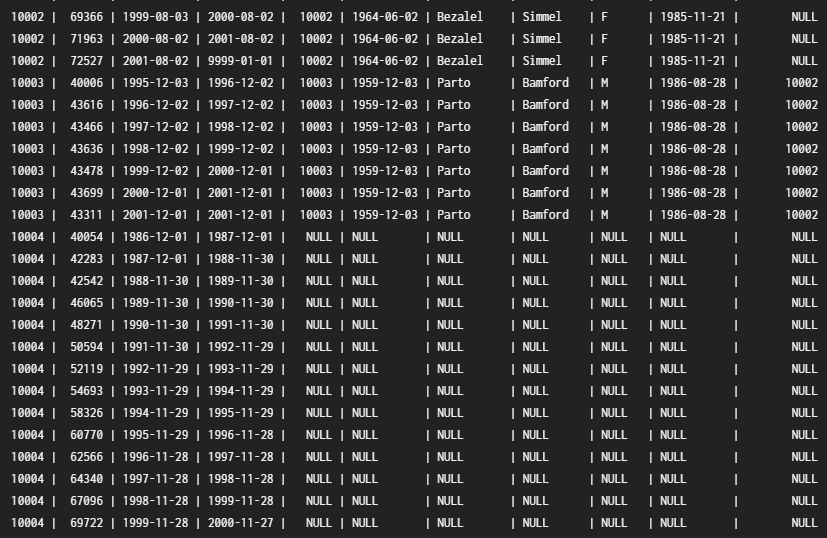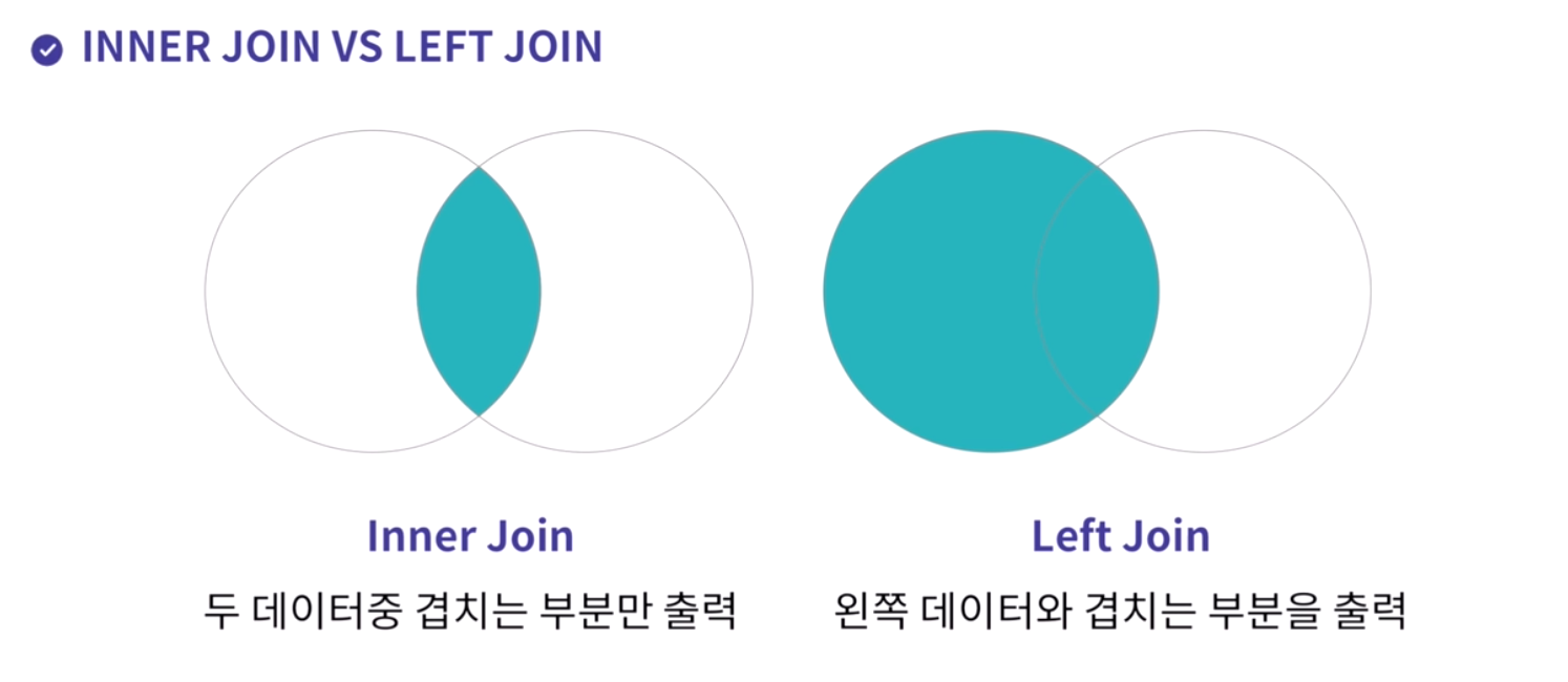 - inner join은 두 테이블이 겹치는 데이터만 가지고 오지만 left join은 왼쪽의 테이블을 모두 가져오고 겹치는 부분을 기준으로 연결까지 한다.