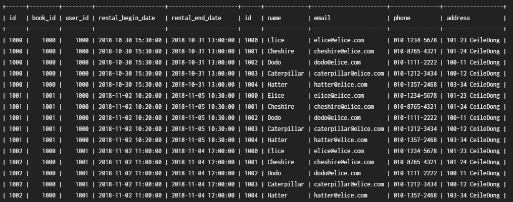 - 하지만 위처럼 조건이 없이 연결하면 rental 테이블의 한 행의 user테이블의 모든 값이 곱해져서 연결되었다. 이렇게 무작정 두 테이블이 연결만 된다. 그래서 조건을 주어야한다.