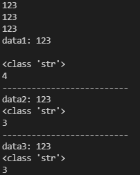 - data2는 rstip()함수로 오른쪽에 whilespace문자(개행,스페이스 등 문자)를 제거해주도록 했다. 여기서는 마지막에 엔터, 즉 개행문자가 제거 되어 123만 저장되어 문자의 길이가 3이 나왔다.