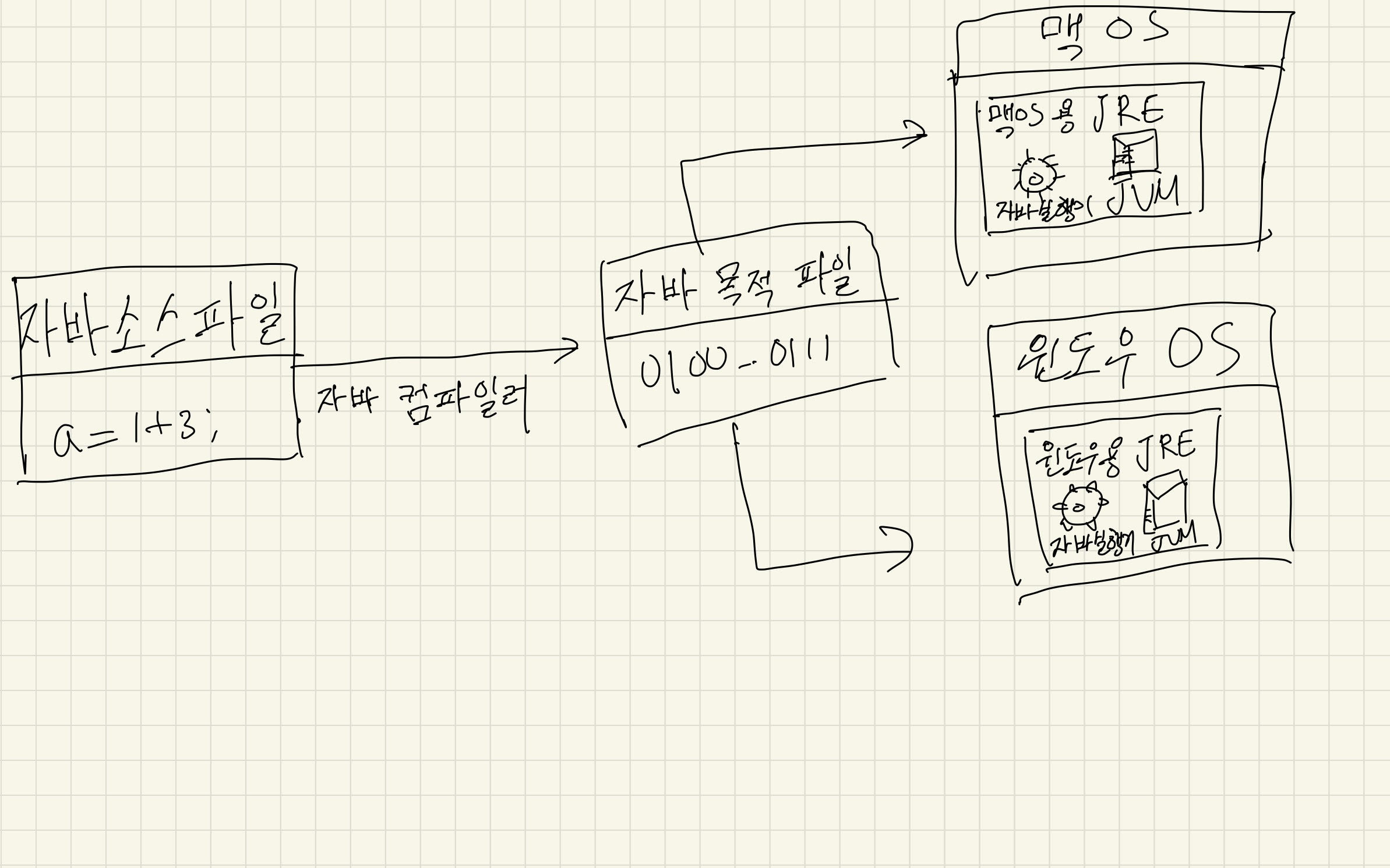 | 비고 | 기종 별 어셈블러 필요 | 기종 별 컴파일러 필요 | 단 하나의 컴파일러만 필요 기종별 JRE 세팅 필요(한번만 설치해주면 됨 |