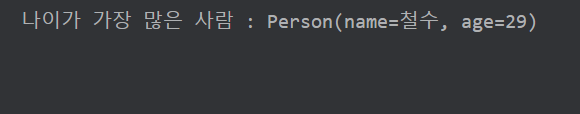 - name과 age라는 property가 들어간 간단한 data class를 정의한다. age peroperty의 defalut 값은 null이다. persons list를 만들면서 영희의 나이를 지정하지 않았기 때문에 null이 대신 쓰인다. list에서 가장 나이가 많은 사람을 찾기 위해 maxByOrNull(코틀린 1.4버전부터 maxBy함수가 폐기되고 maxByorNUll로 대체)함수를 사용한다. maxBy 함수에 전달한 lambda expression은 parameter를 하나 받는다. it이라는 이름을 사용하면 lambda expression의 유일한 인자를 사용할 수 있다. Elvis operator라고 부르는 ?:는 age가 null인경우는 0을 반환하고, 그렇지 않은 경우는 age의 값을 반환하도록 해준다. 영희는 나이를 지정해주지 않았지만 Elvis operator가 null을 0으로 변환해주기 때문에 철수가 가장 나이가 많은 사람으로 선정될 수 있다.