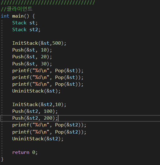 그리고 코드 최적화 단계에서 어플리케이션 별로 스택이 필요 할 수 있으므로 위의 배열 메모리공간과 top변수를 위한 구조체를 생성하고 초기화 함수를 통해 해당 배열이 프로그램 동작시 공간을 할 당할 수 있는 동적배열 형태로 생성하도록 합니다.