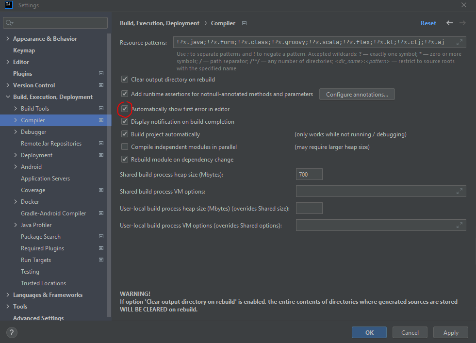 Settings에 Compiler에서 Automatically show first error in editor 부분을 체크해주면 된다.