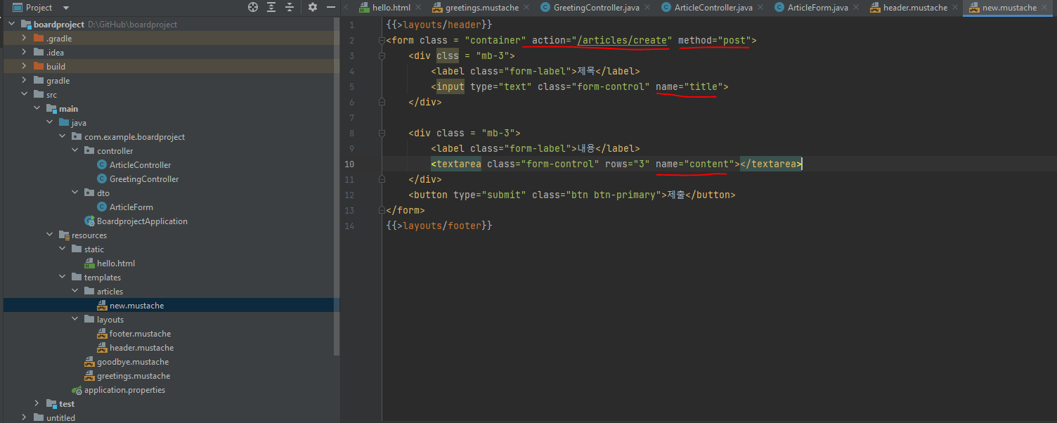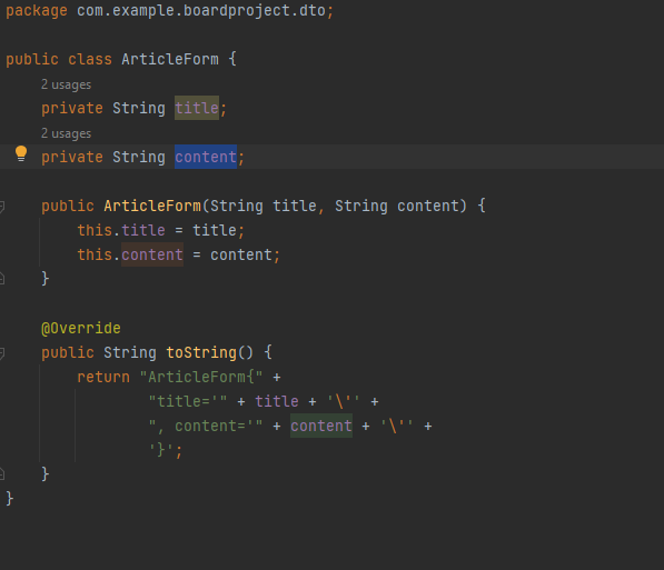 DTO의 field는 view page에서 데이터가 적히는 input과 textarea 태그의 name 속성들의 이름과 같아야 한다. 이렇게 해주면 각각의 name에 해당하는 데이터가 DTO field에 저장된다. 여기서는 input태그의 name이 title이기 때문에 ArticleForm 객체의 title field에 저장된다. textarea의 name은 content이기 때문에 ArticleForm의 title에 저장된다.
