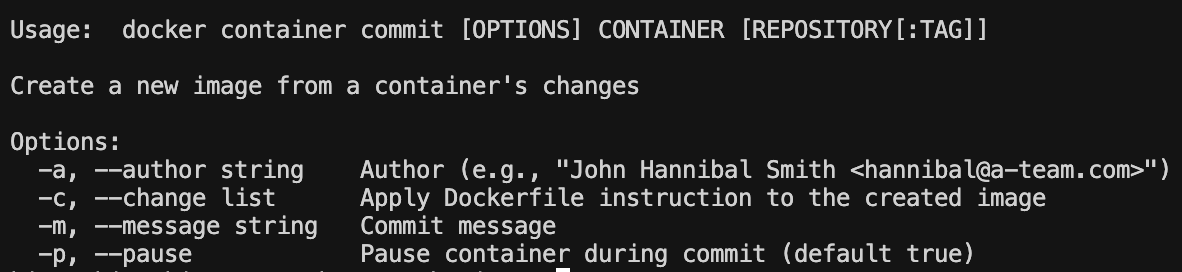 docker container commit 을 사용하면 되는데 여기서 다시 'commit' 명령어에 대한 옵션들을 알고 싶다면 docker container commit --help를 통해서 알아 낼 수 있다.