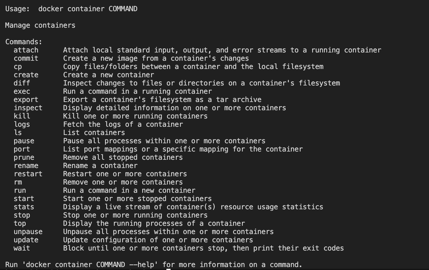 예를 들면 docker container run은 자주 사용하는데 docker container 다음에 run 명령어 말고 다른 명령어를 알고 싶을 경우, docker container 다음에 --help를 붙여주면 docker container와 관련된 다른 명령어를 알 수 있다.