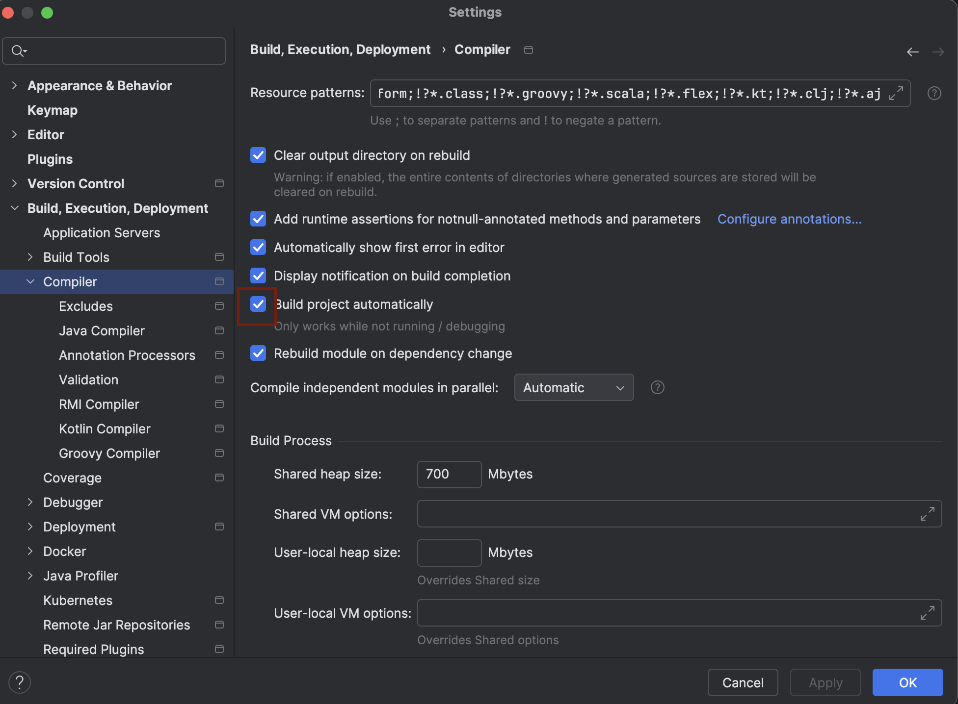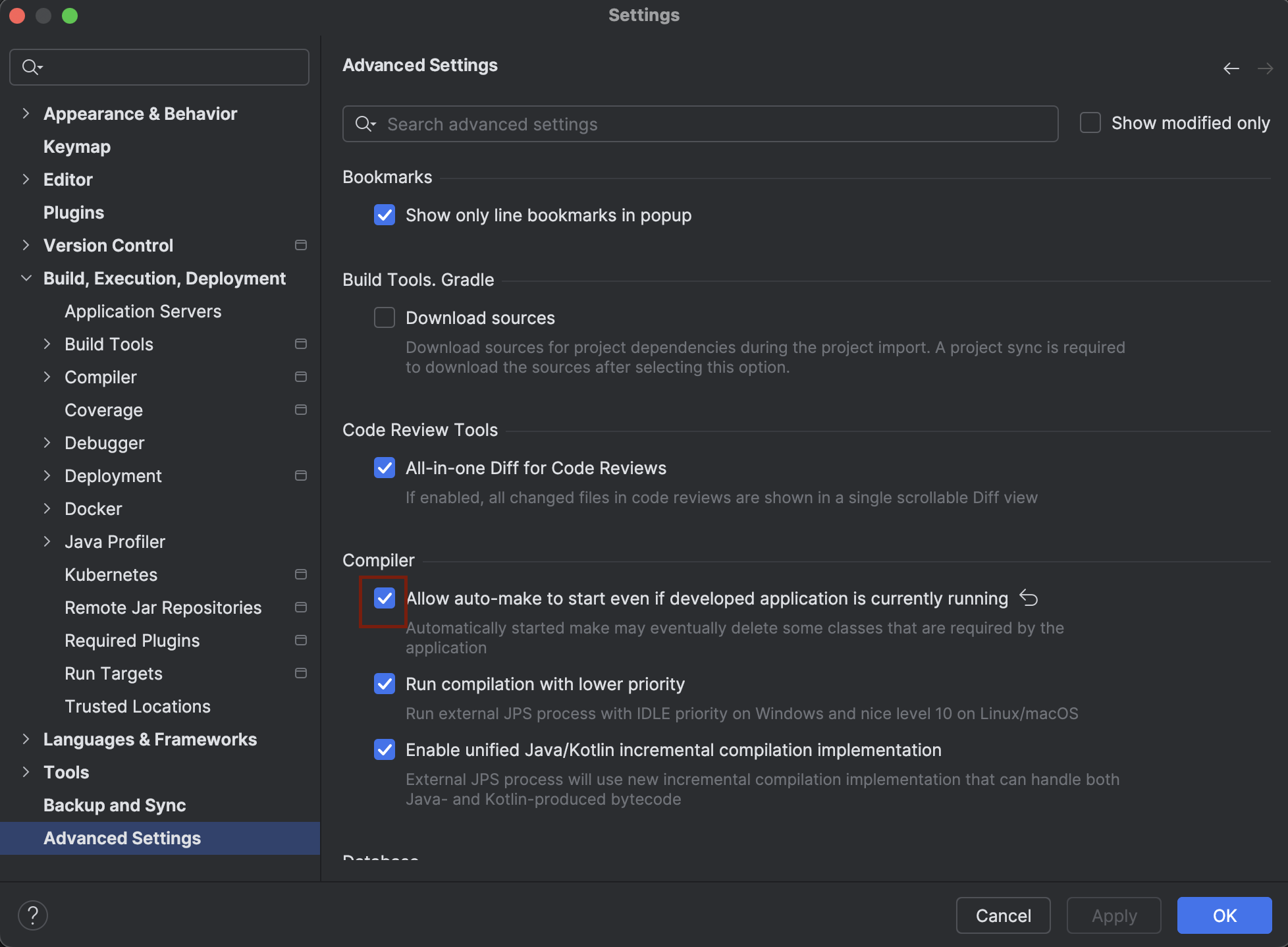 Project Settings(Command + ,) > Build, Execution, Deployment > Advanced Settings 에서 Aullow auto-make to start event if developed application is currently running 체크
