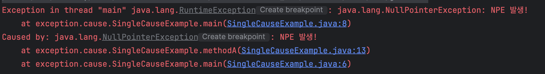 가장 첫 줄은 Exception이라는 키워드와 함께 main 스레드에서 발생했다는 걸 알 수 있고, 발생 에러는 RuntimeException인데, ':' 우측에 NullPointerException이라고 쓰여있다. 실제 발생한 에러를 나타내는 에러메세지다. 그리고 다음줄에 at으로 이 RuntimeException이 발생한 지점은 exception.cause 패키지의 SingleCauseExample 클래스의 8라인의 메인 메서드이다.