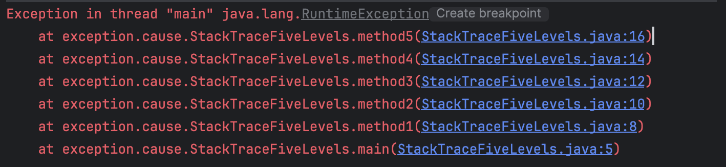 아까 보다는 조금 더 복잡한 호출 구조를 가지고 있는 경우다. main 메서드에서 method1을 호출하고, 그다음 method2 -> method3 -> method4 -> method5를 호출하는데 method5에서 RuntimeException이 발생한다.