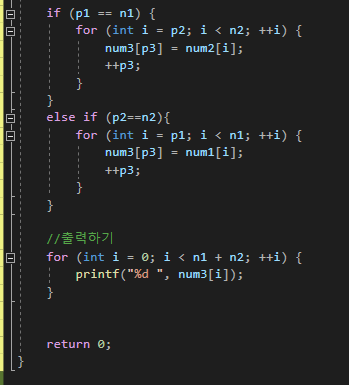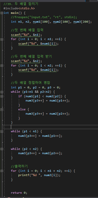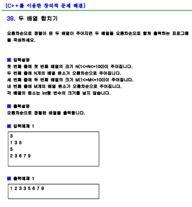 두 배열의 값을 비교하면서 작은 값을 새로운 배열에 입력하고 입력한 배열 쪽의 인덱스 값 증가