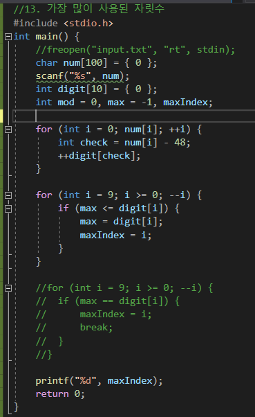 - digit배열에서 max값에 해당하는 값을 찾고 해당 인덱스를 저장(이때 같은 값일 때 큰 값을 채택해야 함으로 부등호에서 등호를 주의해야한다., 같은 값이 나왔을 경우에도 조건문에서 인덱스값을 채택할 수 있도록)
